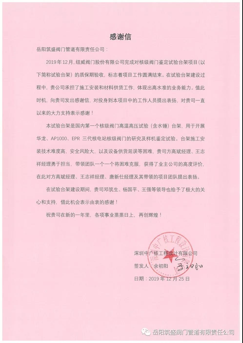 今日,我岳陽筑盛閥門管道有限責(zé)任公司收到深圳中廣核工程設(shè)計(jì)有限公司發(fā)來的感謝信,高度評(píng)價(jià)我公司在其核級(jí)試驗(yàn)臺(tái)架項(xiàng)目建設(shè)過程中的高水準(zhǔn)業(yè)務(wù)能力。