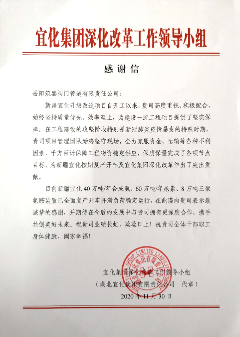 岳陽(yáng)筑盛閥門管道有限責(zé)任公司收到宜化集團(tuán)感謝信
