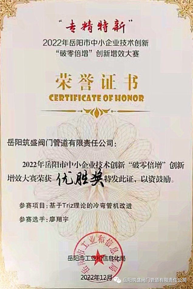 岳筑宣2022年12月6日訊:2022年12月5日我公司委派技術(shù)部廖翔宇工程師參加了2022年岳陽市“專精特新”中小企業(yè)技術(shù)創(chuàng)新“破零倍增”創(chuàng)新增效大賽基于Triz理論的冷彎管機(jī)改進(jìn)項(xiàng)目中榮獲優(yōu)勝獎